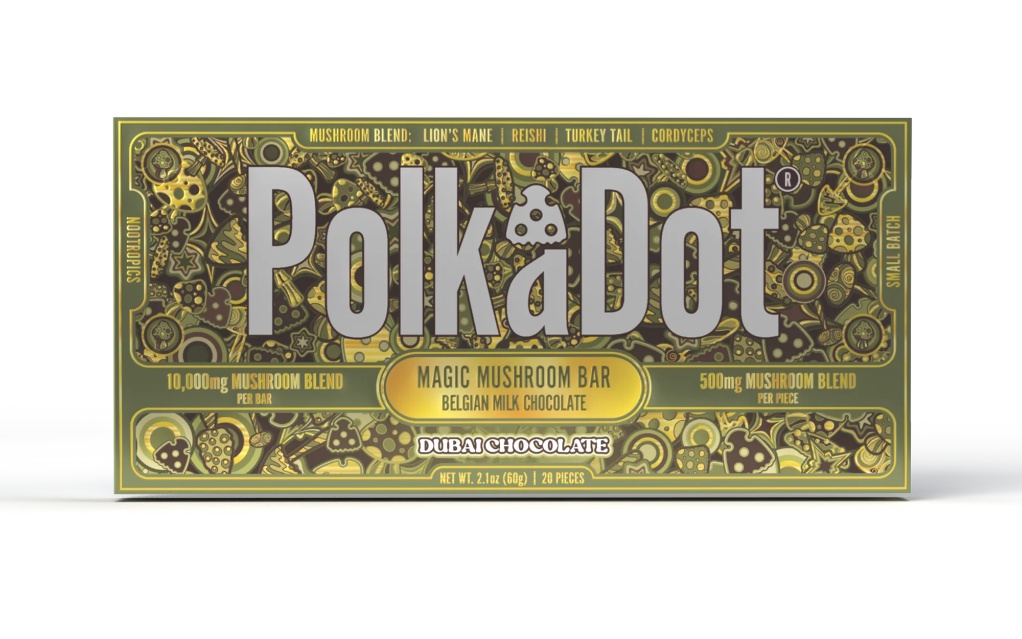 Shop PolkaDot Dubai Chocolate Mushroom Chocolate Bars online at wonderbarchocolate.shop and experience a rich, gourmet twist on infused chocolate today.